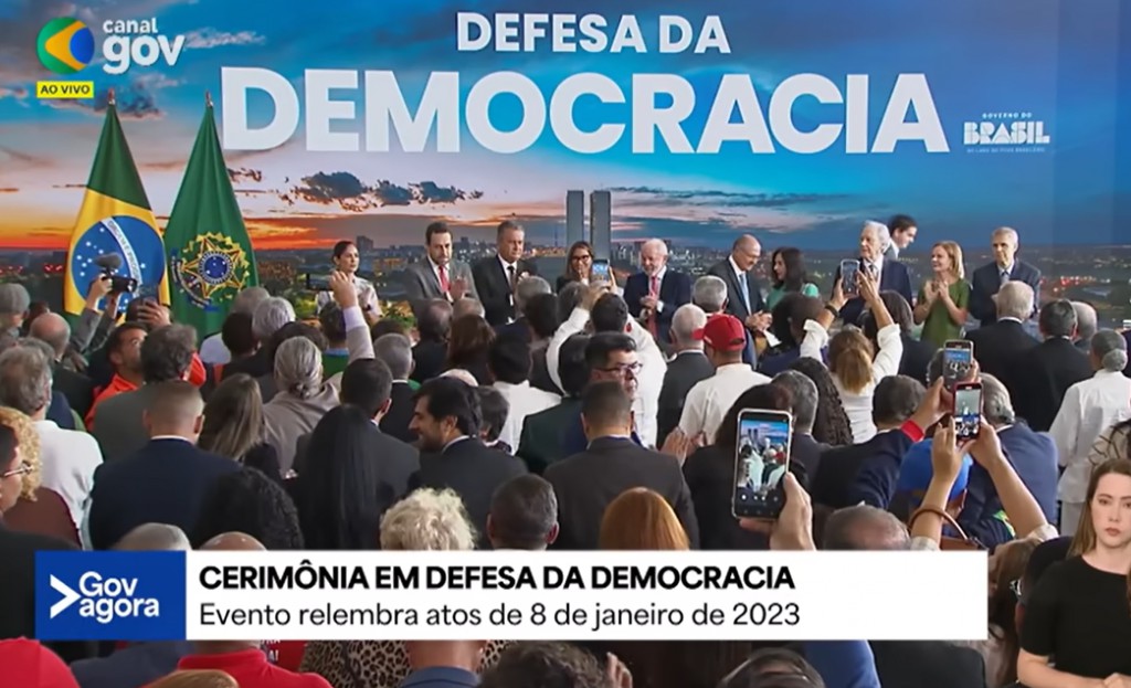 Autoridades do Executivo, Judiciário e Legislativo, além de governadores, ministros, dirigentes de centrais sindicais, incluindo da Central Única dos Trabalhadores (CUT) e de movimentos sociais, participaram nesta quinta-feira (8) de solenidade promovida para marcar os três anos da tentativa de golpe de estado de 8 de janeiro de 2023.